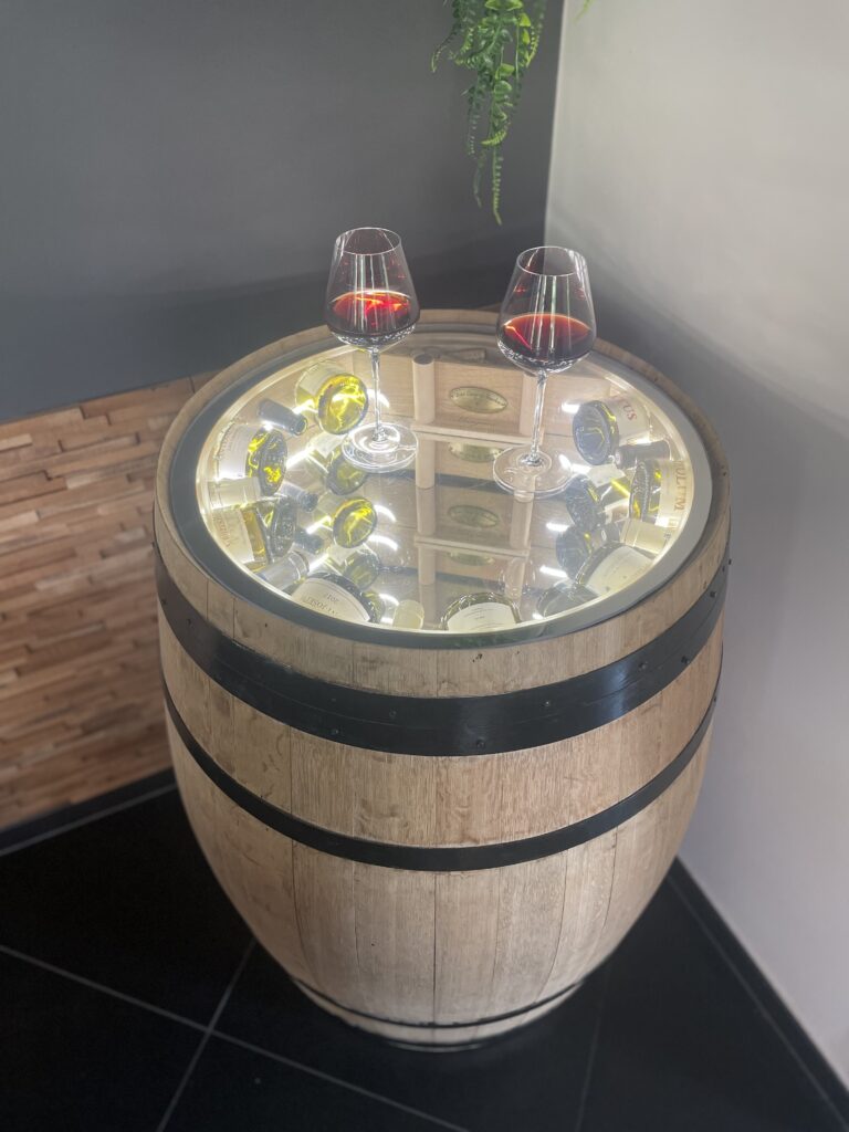 Élément fort et raffiné dans la verticalité d’un tonneau, Altæ ponctue un espace de réception ou une salle de dégustation avec intensité et élégance. Sa présence lumineuse transforme chaque bouteille en mémoire vivante.